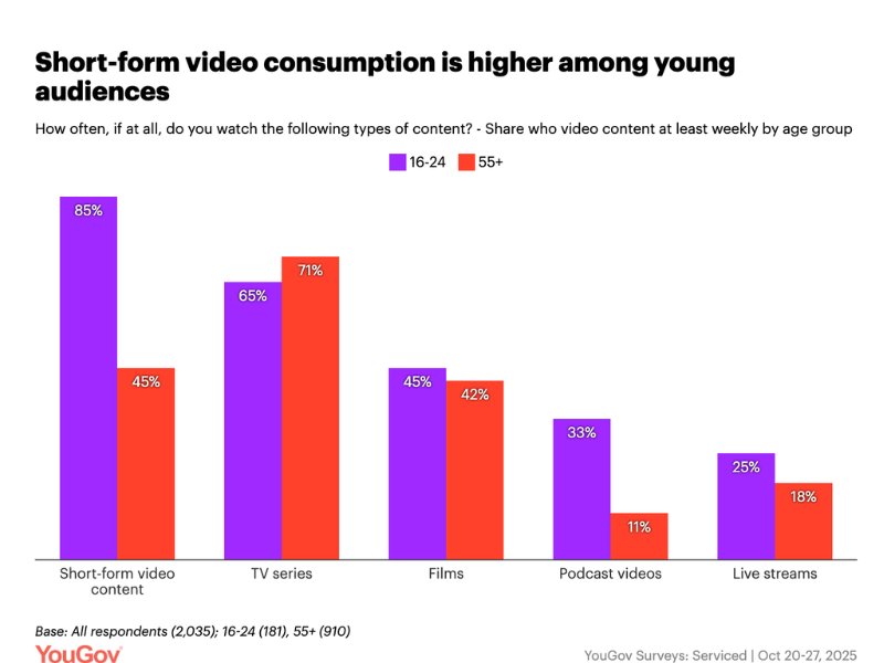 YouGov found 69% of 16–24-year-olds watch short-form video daily, versus 18% of adults 55+. (YouGov)